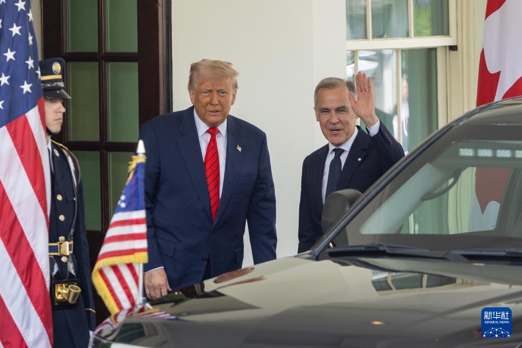 5月6日,美國總統(tǒng)特朗普(中)在華盛頓白宮迎接到訪的加拿大總理卡尼。新華社記者 胡友松 攝