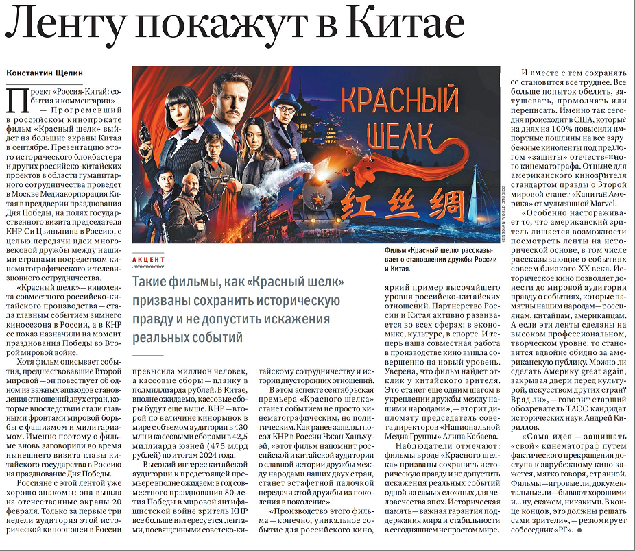當?shù)貢r間5月7日,俄羅斯政府機關報《俄羅斯報》刊發(fā)題為《中俄合拍電影〈紅絲綢〉將在中國上映》的評論文章。文章指出,在俄羅斯紀念蘇聯(lián)偉大衛(wèi)國戰(zhàn)爭勝利80周年前夕,在中國國家主席習近平應邀對俄羅斯進行國事訪問之際,中國中央廣播電視總臺將在莫斯科舉辦中俄合拍電影《紅絲綢》及其他中俄人文合作項目的推介活動,通過影視交流合作傳遞中俄世代友好。文章援引專家觀點強調,電影《紅絲綢》肩負著守護歷史真相的使命,防止人類至暗時刻的歷史被篡改。