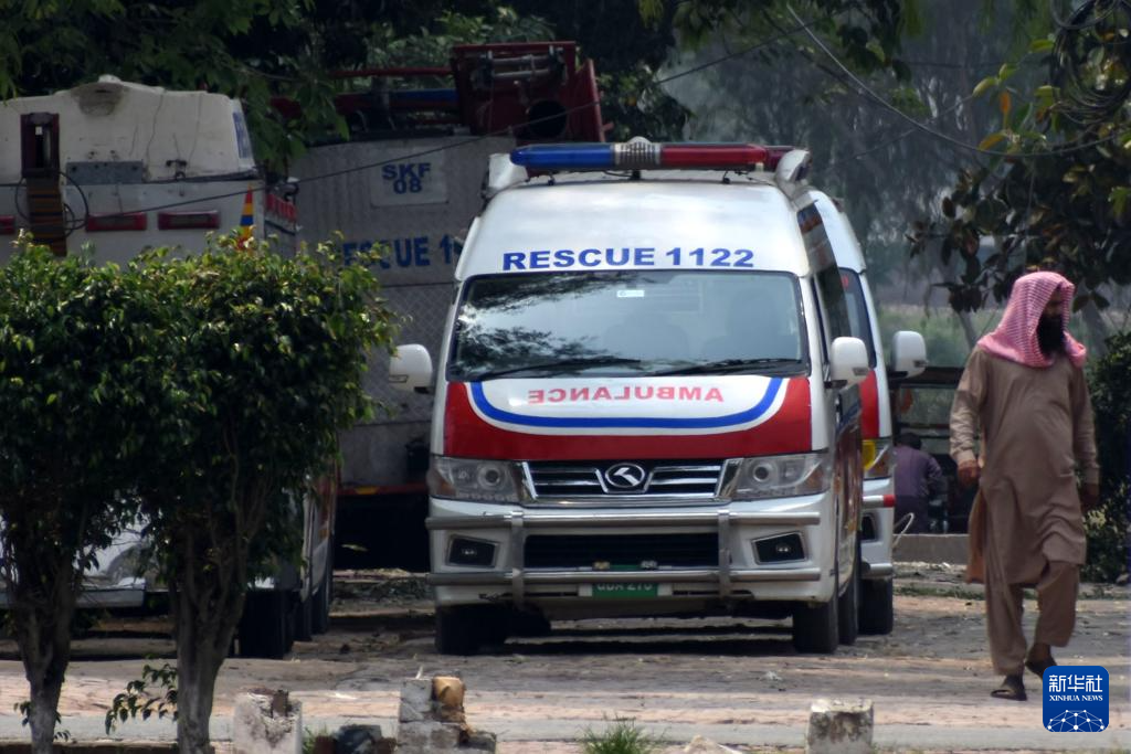 5月7日,救護(hù)車停在巴基斯坦東部旁遮普省謝赫布拉地區(qū)穆里德蓋鎮(zhèn)遭印度導(dǎo)彈破壞的建筑附近。新華社發(fā)(薩賈德攝)