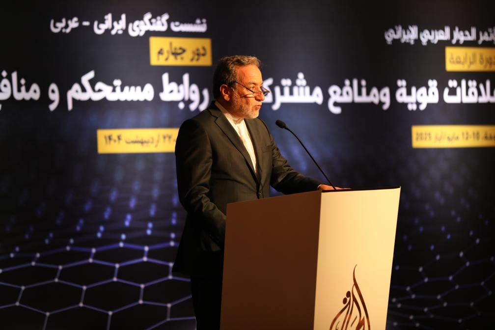 5月10日,伊朗外長(zhǎng)阿拉格齊在卡塔爾多哈出席第四屆阿拉伯-伊朗對(duì)話會(huì)議時(shí)講話。新華社發(fā)(主辦方供圖)