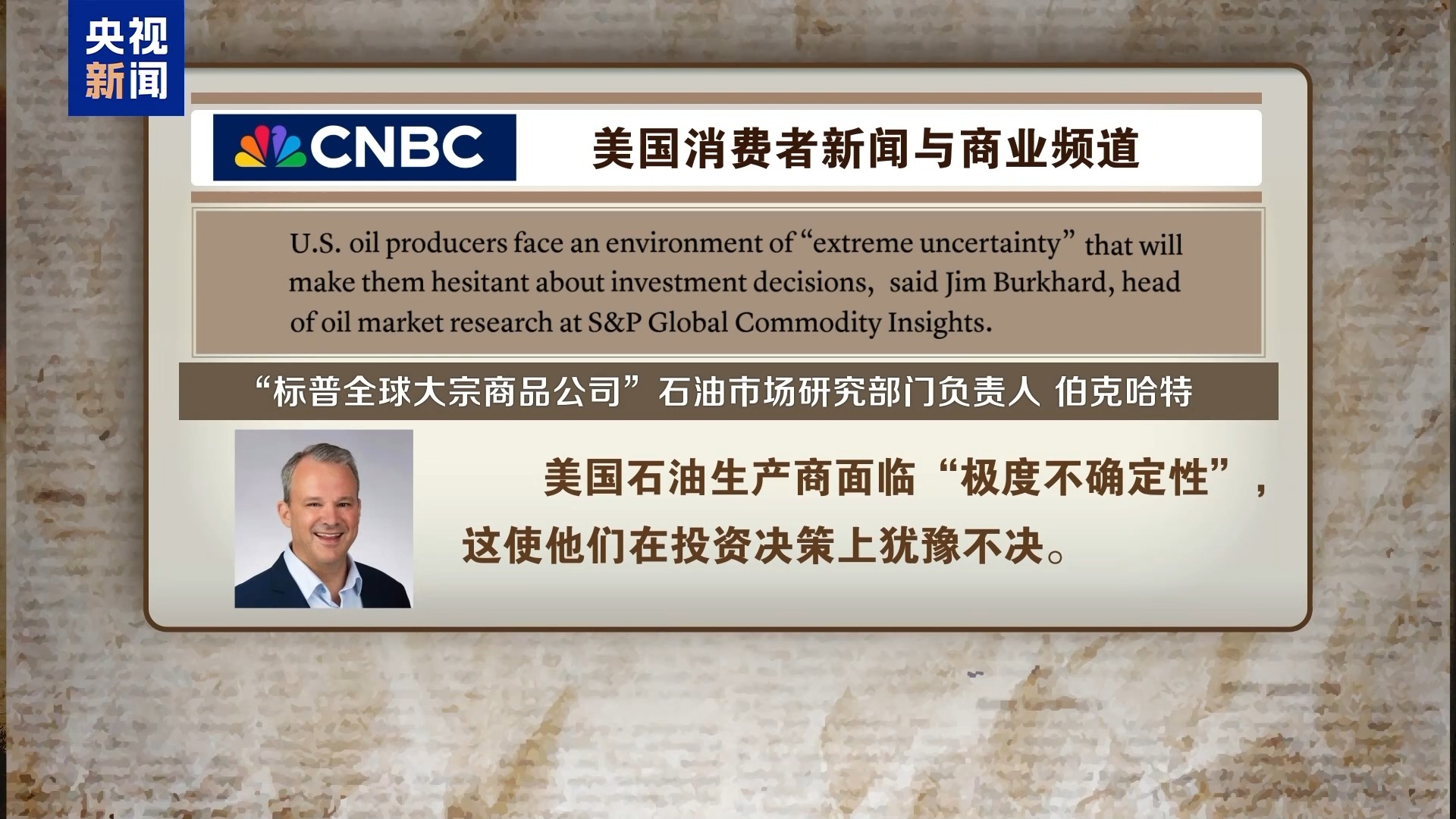 美國(guó)消費(fèi)者新聞與商業(yè)頻道援引“標(biāo)普全球大宗商品公司”石油市場(chǎng)研究部門(mén)負(fù)責(zé)人伯克哈特的話報(bào)道稱(chēng),美國(guó)石油生產(chǎn)商面臨“極度不確定性”,這使他們?cè)谕顿Y決策上猶豫不決。
