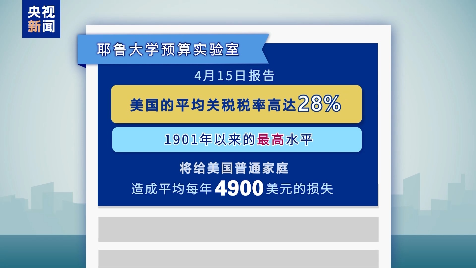 4月15日,在美國(guó)與中國(guó)、英國(guó)達(dá)成協(xié)議前,耶魯大學(xué)預(yù)算實(shí)驗(yàn)室也曾發(fā)布過(guò)一份報(bào)告。這份報(bào)告稱(chēng),美國(guó)的平均關(guān)稅稅率當(dāng)時(shí)高達(dá)28%,為1901年以來(lái)的最高水平。按照當(dāng)時(shí)的關(guān)稅稅率,將給美國(guó)普通家庭造成平均每年4900美元的損失。