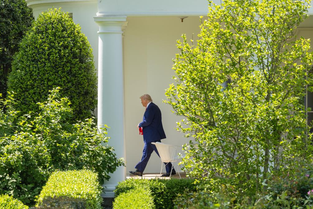 4月29日,在華盛頓白宮,美國總統(tǒng)特朗普走向南草坪準備登機。新華社記者胡友松攝