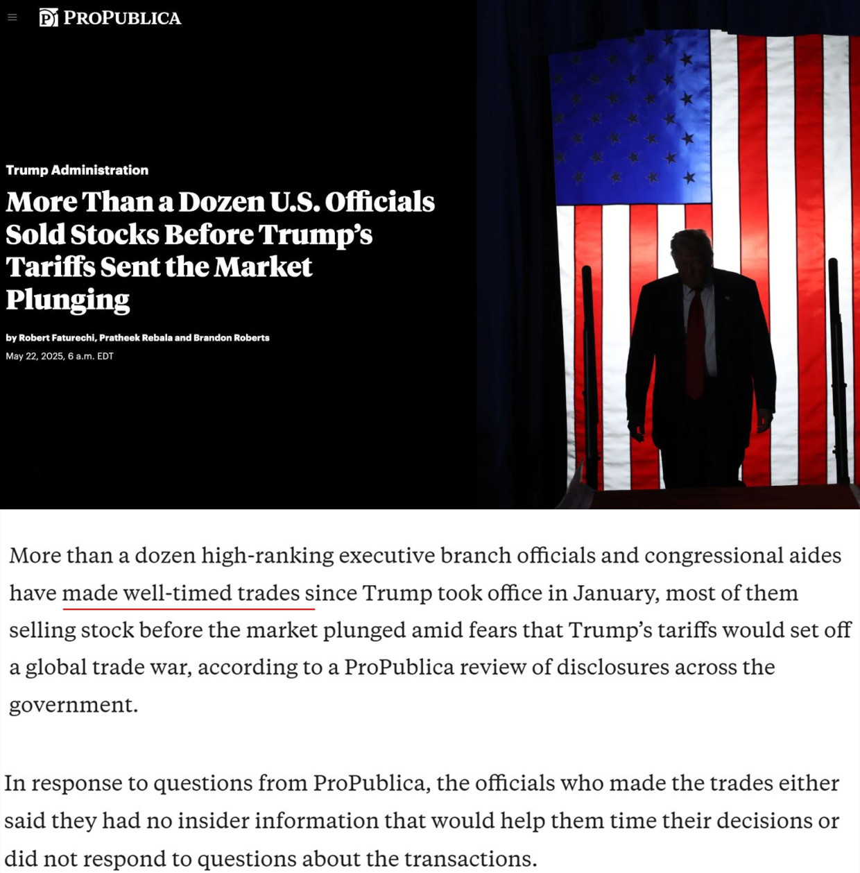 最近,美國“專業(yè)公眾”新聞調(diào)查網(wǎng)站在查詢了數(shù)百份證券交易披露報告后發(fā)現(xiàn),自本屆美國政府1月上臺以來,有十幾名美國政府高級官員、國會工作人員乃至國會議員進行了時機“恰到好處”的交易,其中大部分人在美國關(guān)稅政策導致市場暴跌之前拋售了股票;還有人則在相關(guān)法案獲批前“及時”購買了該法案所利好的行業(yè)公司股票。