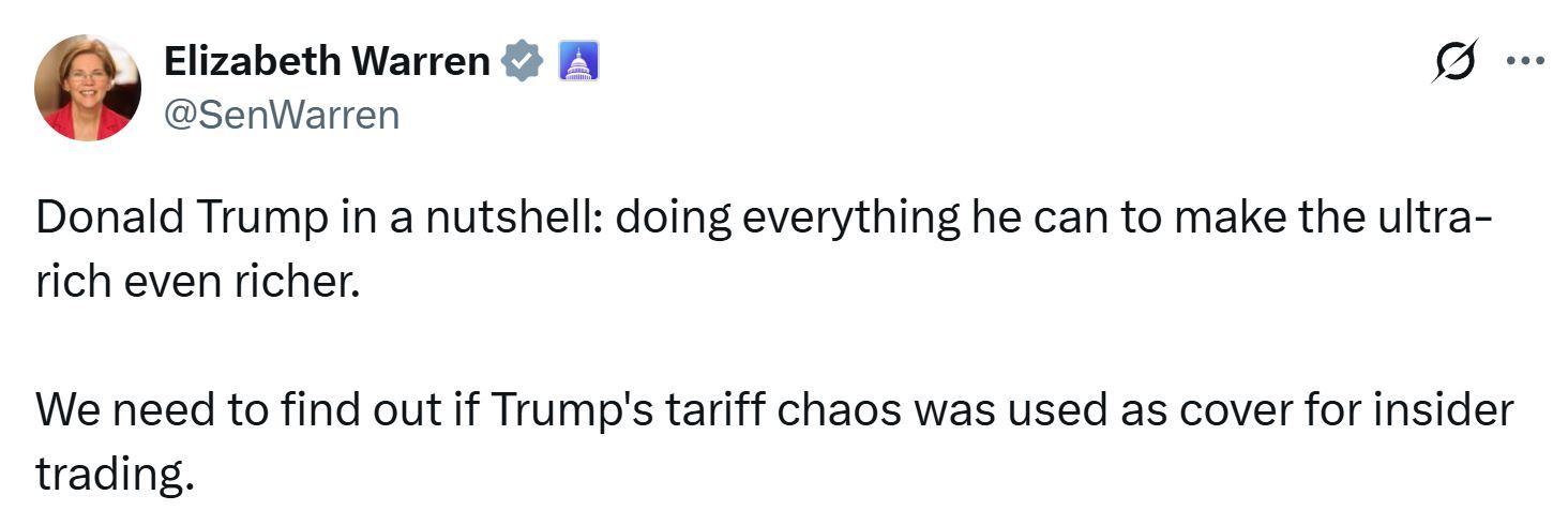 美國民主黨籍聯(lián)邦參議員伊麗莎白·沃倫表示,鑒于特朗普政府正盡一切可能讓美國富人們更加富有,有必要弄清楚白宮制造的關(guān)稅混亂是否被用作內(nèi)幕交易的掩護。