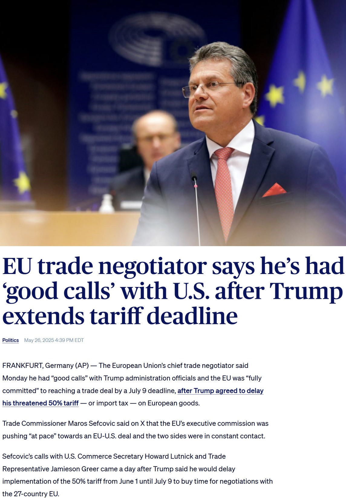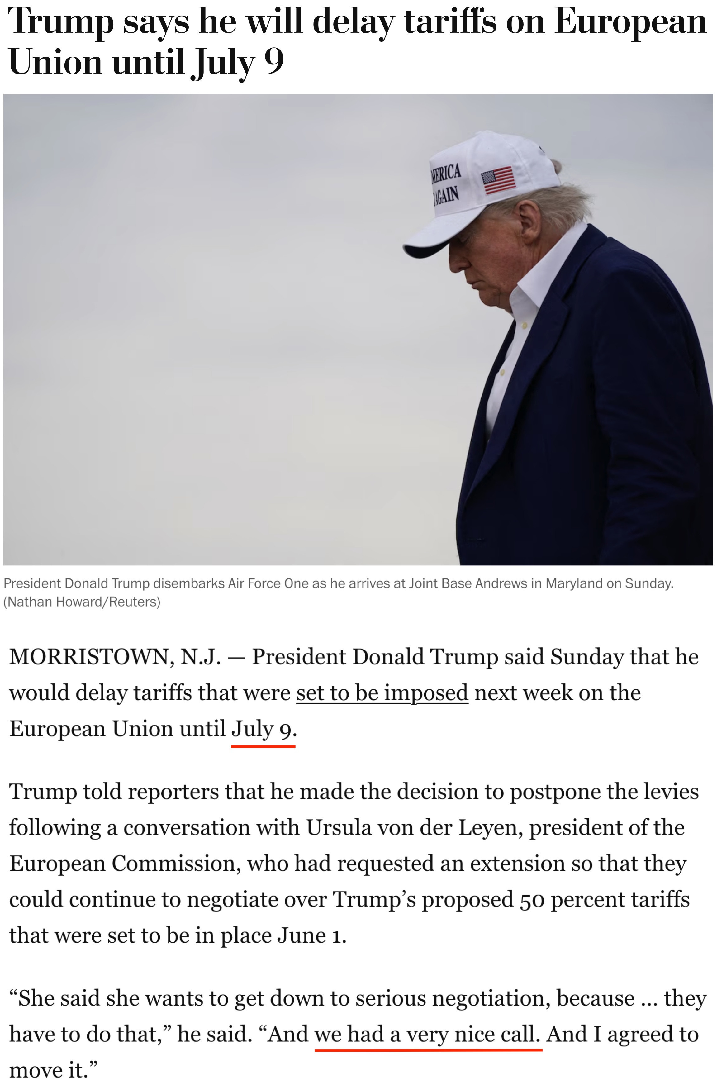 他25日告訴記者,自己當天與歐盟委員會主席馮德萊恩“愉快”地通了電話,并應(yīng)對方要求,決定將原計劃從6月1日開始對歐盟加征的50%的關(guān)稅推遲到7月9日,以便雙方有時間就此進行談判。