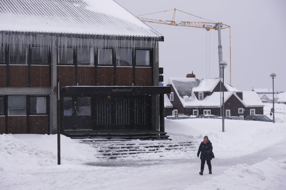 2025年3月24日,在丹麥自治領地格陵蘭島首府努克,一名行人經(jīng)過格陵蘭島自治議會。新華社記者張玉亮攝