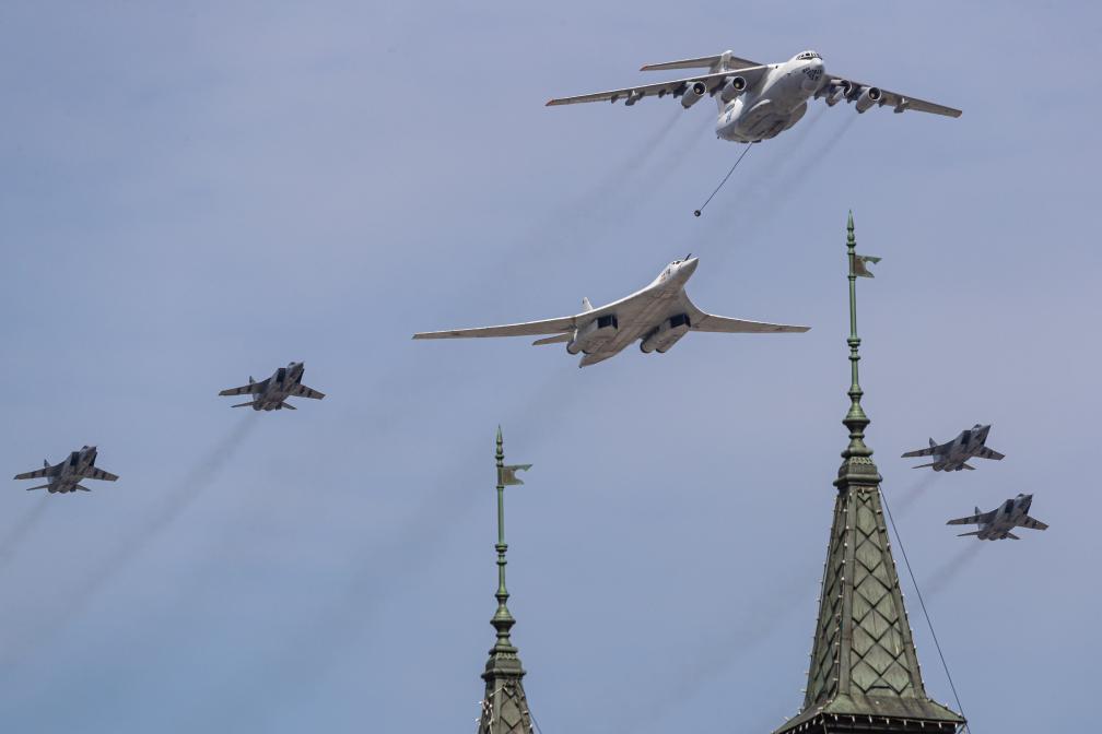 2022年5月7日,在俄羅斯首都莫斯科,米格-31戰(zhàn)機、圖-160戰(zhàn)略轟炸機、伊爾-78空中加油機(從后至前)編隊飛過紅場上空。新華社記者白雪騏攝