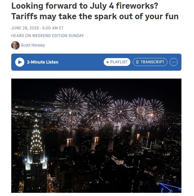 美國(guó)全國(guó)公共廣播電臺(tái)網(wǎng)站近日發(fā)表一篇文章說,美國(guó)人即將迎來獨(dú)立日慶典,燒烤派對(duì)、節(jié)日游行和煙花表演自然是重頭戲。但受特朗普政府加征關(guān)稅影響,今年煙花價(jià)格可能飆升,供應(yīng)也將更加緊俏。這是因?yàn)椋绹?guó)用于慶祝獨(dú)立日的火箭煙花、手持電光花和噴泉禮花,幾乎完全依賴中國(guó)供應(yīng)——而早在一千多年前,正是中國(guó)人發(fā)明了煙花。
