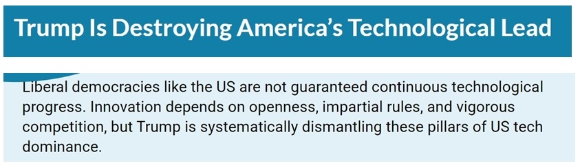文章稱,研究機構(gòu)、人才、資金等一直是支撐美國創(chuàng)新發(fā)展的重要支柱,而美國現(xiàn)政府正在系統(tǒng)性地拆除這些支柱,斷送自己的科技領(lǐng)先地位。