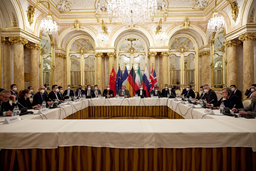 這是2021年12月27日在奧地利維也納拍攝的伊朗核問題全面協(xié)議聯(lián)合委員會(huì)政治總司長級(jí)會(huì)議現(xiàn)場(chǎng)。新華社發(fā)(歐盟駐維也納代表團(tuán)供圖)
