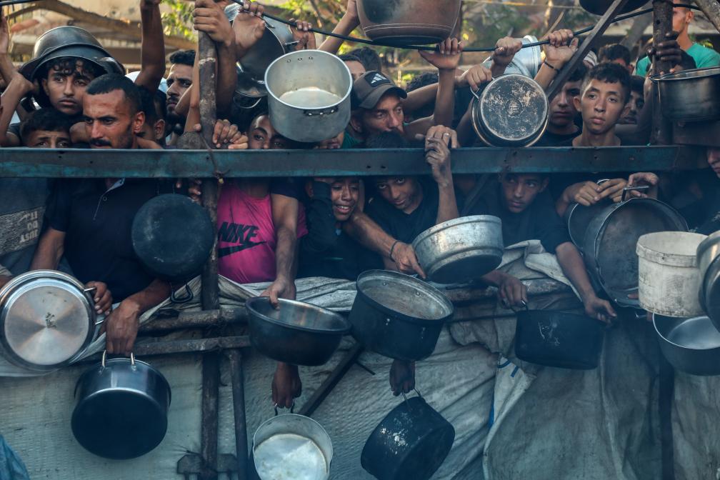 7月20日,在加沙城,當?shù)孛癖姷却I(lǐng)取食物。新華社發(fā)(里澤克·阿卜杜勒賈瓦德攝)