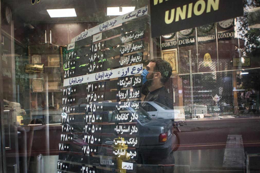 2020年10月14日,一名工作人員在伊朗德黑蘭一處外幣兌換所整理櫥窗。新華社發(fā)(艾哈邁德·哈拉比薩斯攝)