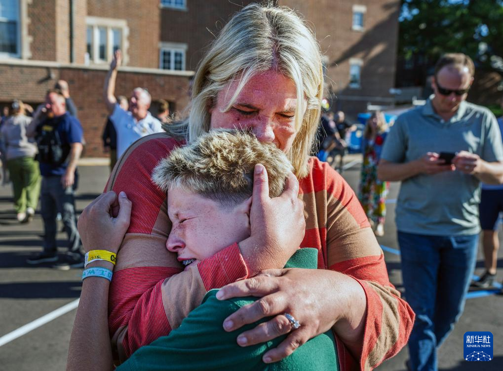8月27日,在美國(guó)明尼蘇達(dá)州明尼阿波利斯市南部一所學(xué)校,一名母親安慰自己的孩子。新華社/美聯(lián)