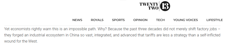 文章指出,美國的關(guān)稅策略不是一項大膽的戰(zhàn)略,而是否認現(xiàn)實的癥狀。中國贏得制造業(yè)桂冠不是通過短期手段,而是通過系統(tǒng)地建立一個規(guī)模、一體化和復雜程度無與倫比的工業(yè)生態(tài)系統(tǒng)。