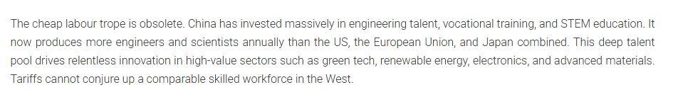 中國在工程人才、職業(yè)培訓以及科學、技術(shù)、工程和數(shù)學教育等方面投入了大量資金。現(xiàn)在,它每年培養(yǎng)的工程師和科學家比美國、歐盟和日本的總和還要多。這種深厚的人才庫推動了綠色技術(shù)、可再生能源、電子和先進材料等高價值領(lǐng)域的不懈創(chuàng)新。
