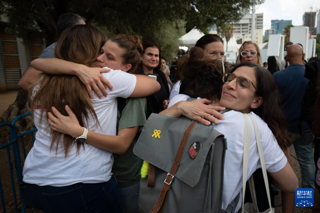 10月9日,在以色列特拉維夫,人們獲悉加沙?;饏f(xié)議的消息后相互慶祝,期待被扣押的人員早日獲釋。新華社記者 陳君清 攝