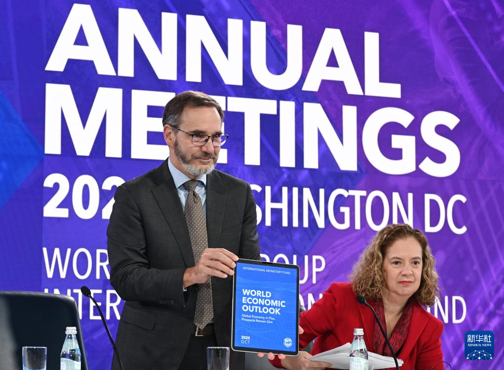 10月14日,在美國華盛頓,國際貨幣基金組織首席經濟學家皮埃爾-奧利維耶·古蘭沙(左)在《世界經濟展望報告》新聞發(fā)布會上展示報告。新華社記者 李睿 攝