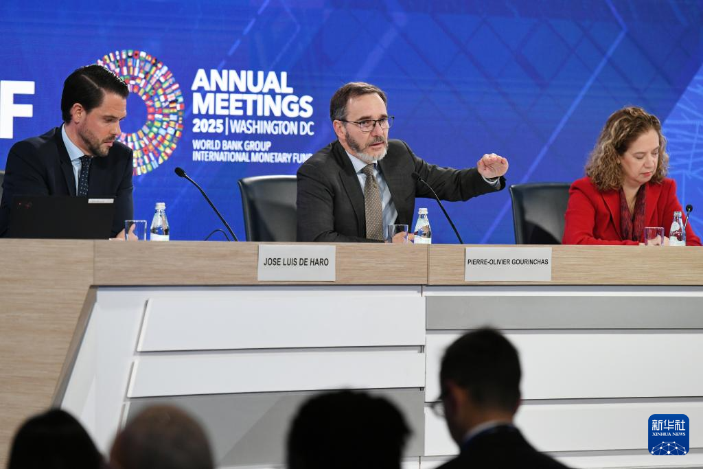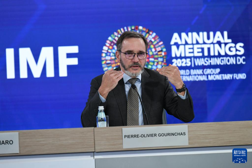 10月14日,在美國華盛頓,國際貨幣基金組織首席經濟學家皮埃爾-奧利維耶·古蘭沙(中)在《世界經濟展望報告》新聞發(fā)布會上講話。新華社記者 李睿 攝