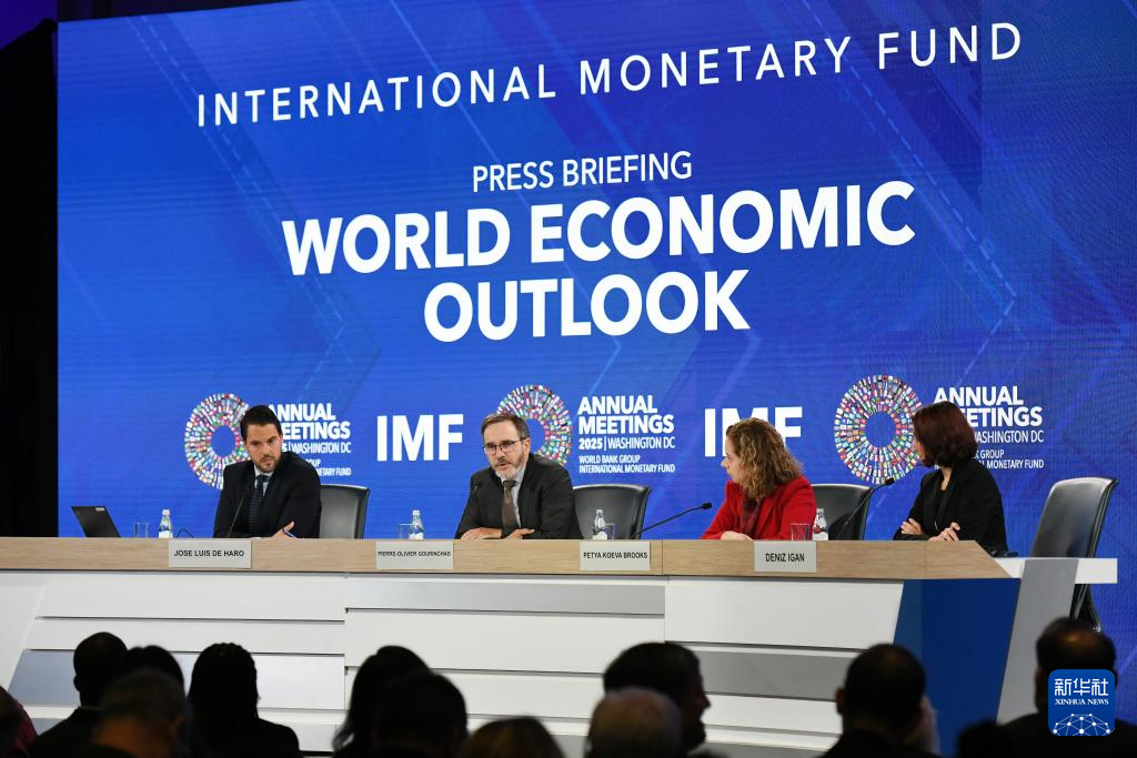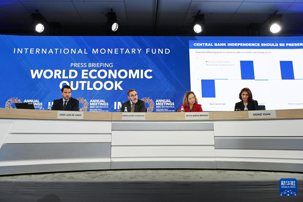 10月14日,在美國華盛頓,國際貨幣基金組織首席經濟學家皮埃爾-奧利維耶·古蘭沙(左二)在《世界經濟展望報告》新聞發(fā)布會上講話。新華社記者 李睿 攝