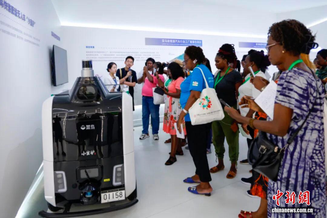 2025年9月16日,中非婦女官員能力建設(shè)研修班的25名學(xué)員來到杭州的中國(guó)人工智能小鎮(zhèn)。圖為研修班成員參觀快遞配送無(wú)人車。 中新社記者 肖健 攝