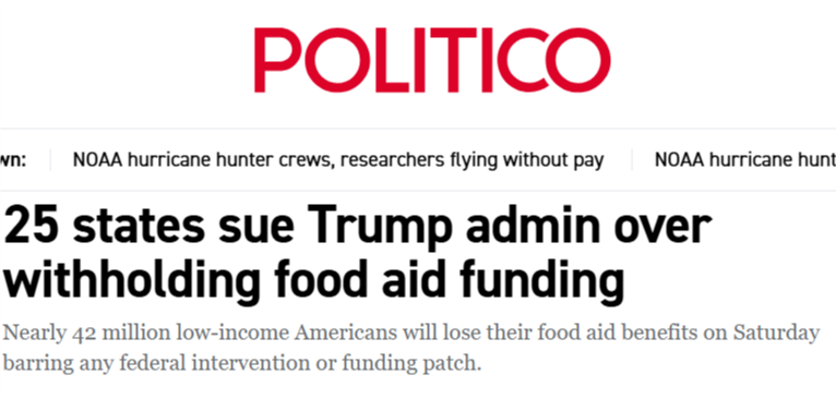 據(jù)美國《政治報》網(wǎng)站報道,受政府持續(xù)“停擺”影響,美農(nóng)業(yè)部宣布暫停其“補充營養(yǎng)援助計劃”(SNAP),11月1日起停止發(fā)放食品救濟。目前這一項目覆蓋約4200萬人,約占美國總?cè)丝诎朔种唬渲卸鄶?shù)為低收入群體和殘障人士。SNAP項目暫停后,他們的生活將難以為繼。當?shù)貢r間28日,民主黨主政的25個州和首都華盛頓對聯(lián)邦政府提起訴訟,要求動用聯(lián)邦應(yīng)急資金,以維持這一項目。