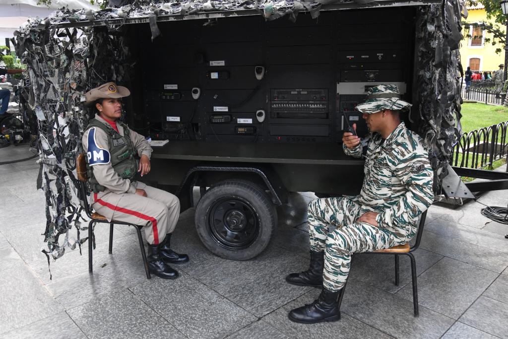 10月4日,在委內瑞拉首都加拉加斯的玻利瓦爾廣場,玻利瓦爾民兵組織成員操作通信設備。新華社發(fā)(馬科斯·薩爾加多攝)