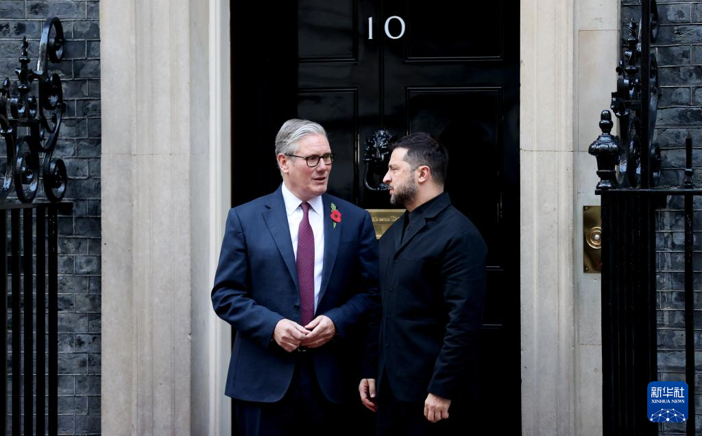 10月24日,在英國倫敦唐寧街10號首相府前,英國首相斯塔默(左)與到訪的烏克蘭總統(tǒng)澤連斯基交談。新華社記者 李穎 攝