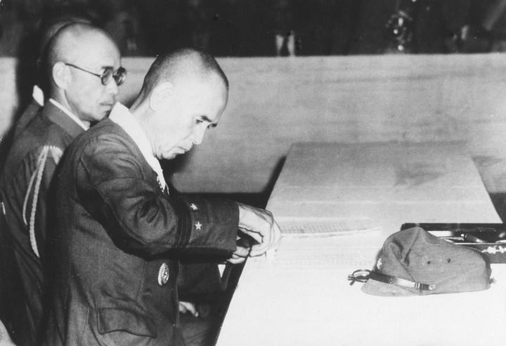 1945年9月9日,南京舉行中國(guó)戰(zhàn)區(qū)日軍投降儀式,侵華日軍總司令岡村寧次代表日軍簽署投降書(shū)。新華社發(fā)