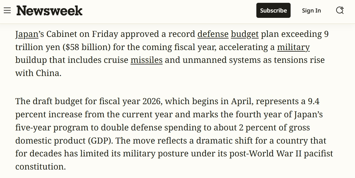 美國《新聞周刊》的報(bào)道稱,日本2026財(cái)年防衛(wèi)預(yù)算比今年增加了9.4%。新預(yù)算的一個重點(diǎn)是加強(qiáng)日本“遠(yuǎn)距離打擊敵方目標(biāo)的能力”,這大大偏離了日本長期以來嚴(yán)格限制使用武力用于自衛(wèi)的原則。
