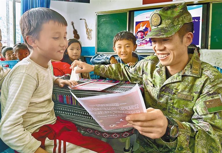 圖為在林芝市墨脫縣格當(dāng)鄉(xiāng),駐地官兵為小學(xué)生普及國防知識(shí)。郎玲 記者 王敏 攝