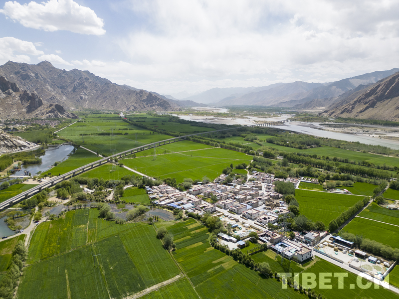 圖為拉薩市曲水縣,拉日鐵路從田野、河畔之中穿行而過(guò),繪就一幅人與自然和諧相處的生態(tài)畫(huà)卷。 攝影:央拉