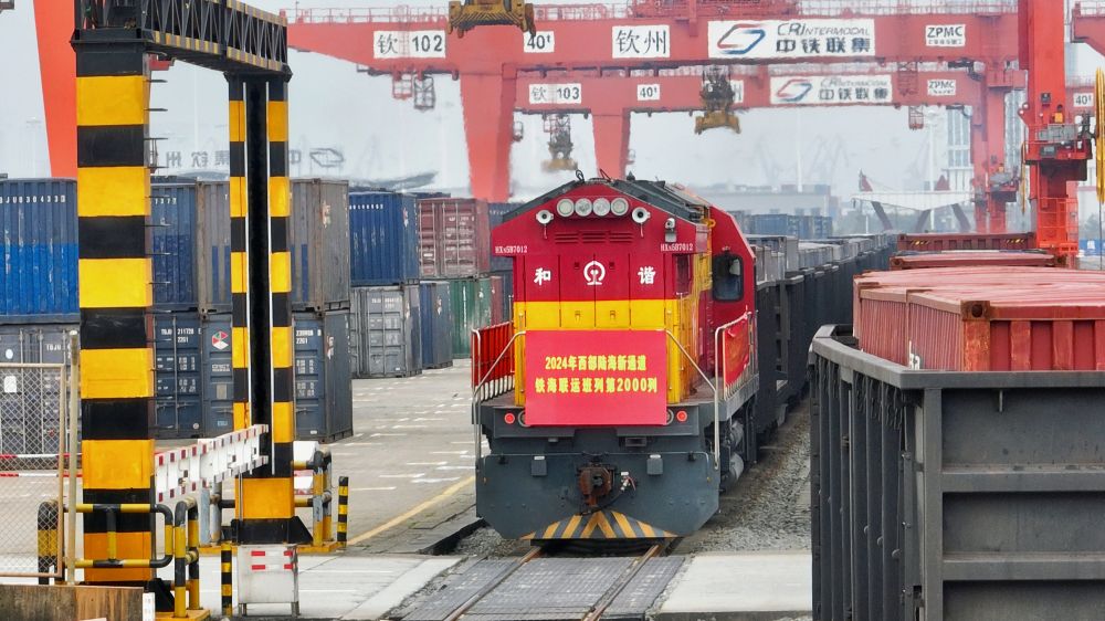 3月17日上午,一列滿載緬甸黑芝麻、海南椰子汁、廣西白糖等貨物的海鐵聯(lián)運(yùn)班列,從欽州鐵路集裝箱中心站緩緩發(fā)出駛向四川城廂站。這是2024年西部陸海新通道開(kāi)行的第2000列海鐵聯(lián)運(yùn)班列,同比增長(zhǎng)16.8%,提前14天完成一季度班列開(kāi)行任務(wù)。