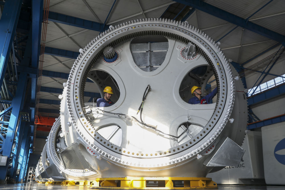 2024年3月5日,在位于黑龍江省齊齊哈爾市的中國一重集團有限公司風電裝備生產(chǎn)制造廠生產(chǎn)車間,工作人員在組裝設(shè)備。新華社記者 張濤 攝