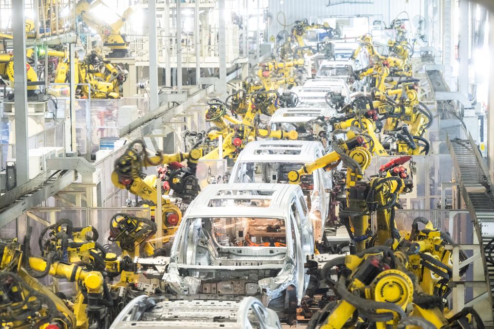 4月1日,在位于湖北武漢市經(jīng)開區(qū)的嵐圖汽車電動(dòng)化焊裝車間,機(jī)器人在流水線上作業(yè)。新華社記者 肖藝九 攝