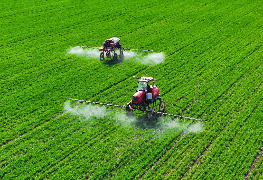 3月19日,自走式無人植保機(jī)在安徽省亳州市譙城區(qū)趙橋鄉(xiāng)雙樓村的無人農(nóng)場(chǎng)進(jìn)行除草作業(yè)(無人機(jī)照片)。新華社記者 杜宇 攝
