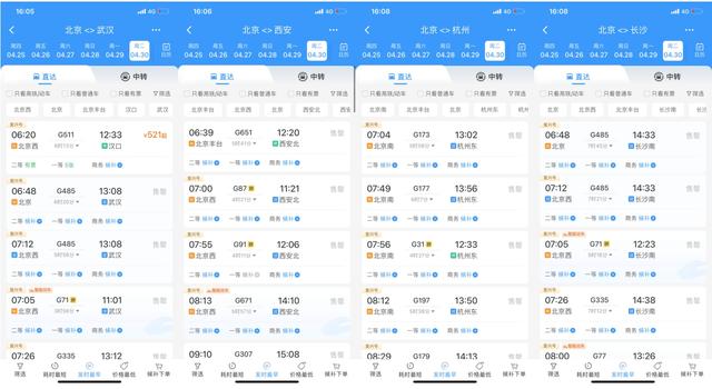 從節(jié)前預訂情況看,4月30日北京出發(fā),前往武漢、西安、杭州、長沙等方向車票極為緊俏。截至16日16時,上述方向車票大面積售罄,僅清晨6時許出發(fā)車次尚存余票。