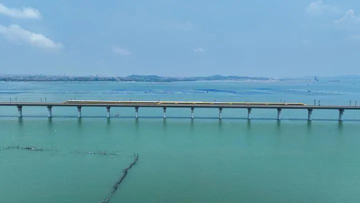 2023年6月28日,CR450動(dòng)車(chē)組試驗(yàn)列車(chē)在湄洲灣跨海大橋交會(huì)運(yùn)行,單列最高運(yùn)行時(shí)速達(dá)到453公里。(鐵科院集團(tuán)公司供圖)