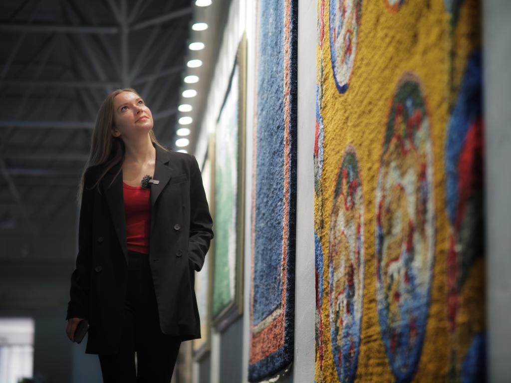 2024年3月20日,新華社外籍記者達(dá)莎在西寧市圣源地毯集團(tuán)生產(chǎn)車間參觀。新華社記者趙宇攝
