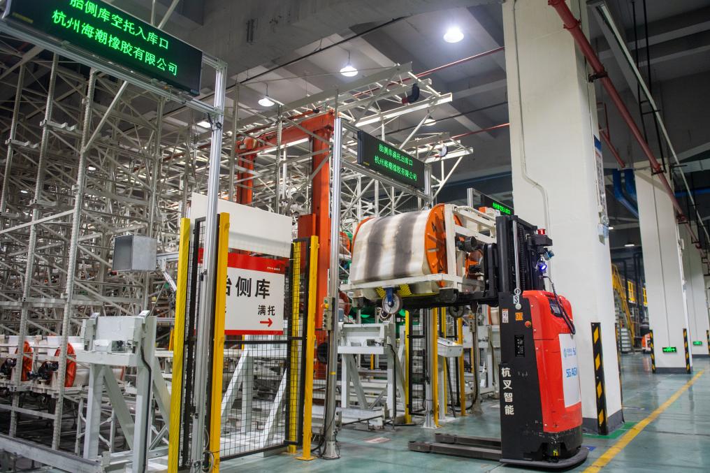 在杭州市錢塘區(qū)中策橡膠集團(tuán)股份有限公司未來(lái)工廠內(nèi),無(wú)人叉車在運(yùn)輸產(chǎn)品(2024年2月23日攝)。新華社記者 江漢 攝