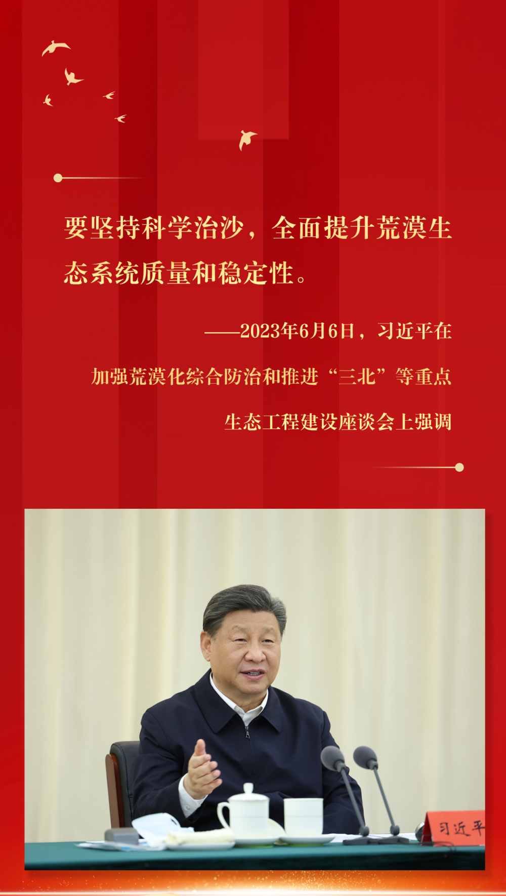 2023年6月5日至6日,習近平在內(nèi)蒙古巴彥淖爾考察,并主持召開加強荒漠化綜合防治和推進“三北”等重點生態(tài)工程建設(shè)座談會。這是6日上午,習近平在臨河區(qū)國營新華林場考察。