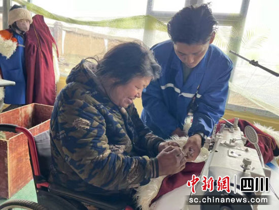 扎西奪爾登幫助殘疾員工裁剪。阿壩州文明辦供圖