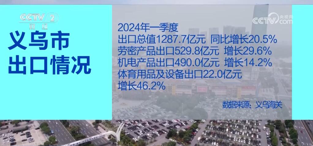 數(shù)據(jù)顯示,2024年一季度,義烏市出口總值達1287.7億元,同比增長20.5%。其中,勞密產(chǎn)品出口529.8億元,增長29.6%;機電產(chǎn)品出口490.0億元,增長14.2%;而體育用品及設(shè)備出口達到22.0億元,增長46.2%。業(yè)內(nèi)人士表示,巴黎奧運會即將召開,以及外商圣誕采購季開始,歐美市場補庫存需求增加,使得相關(guān)產(chǎn)品出口占比顯著提升。