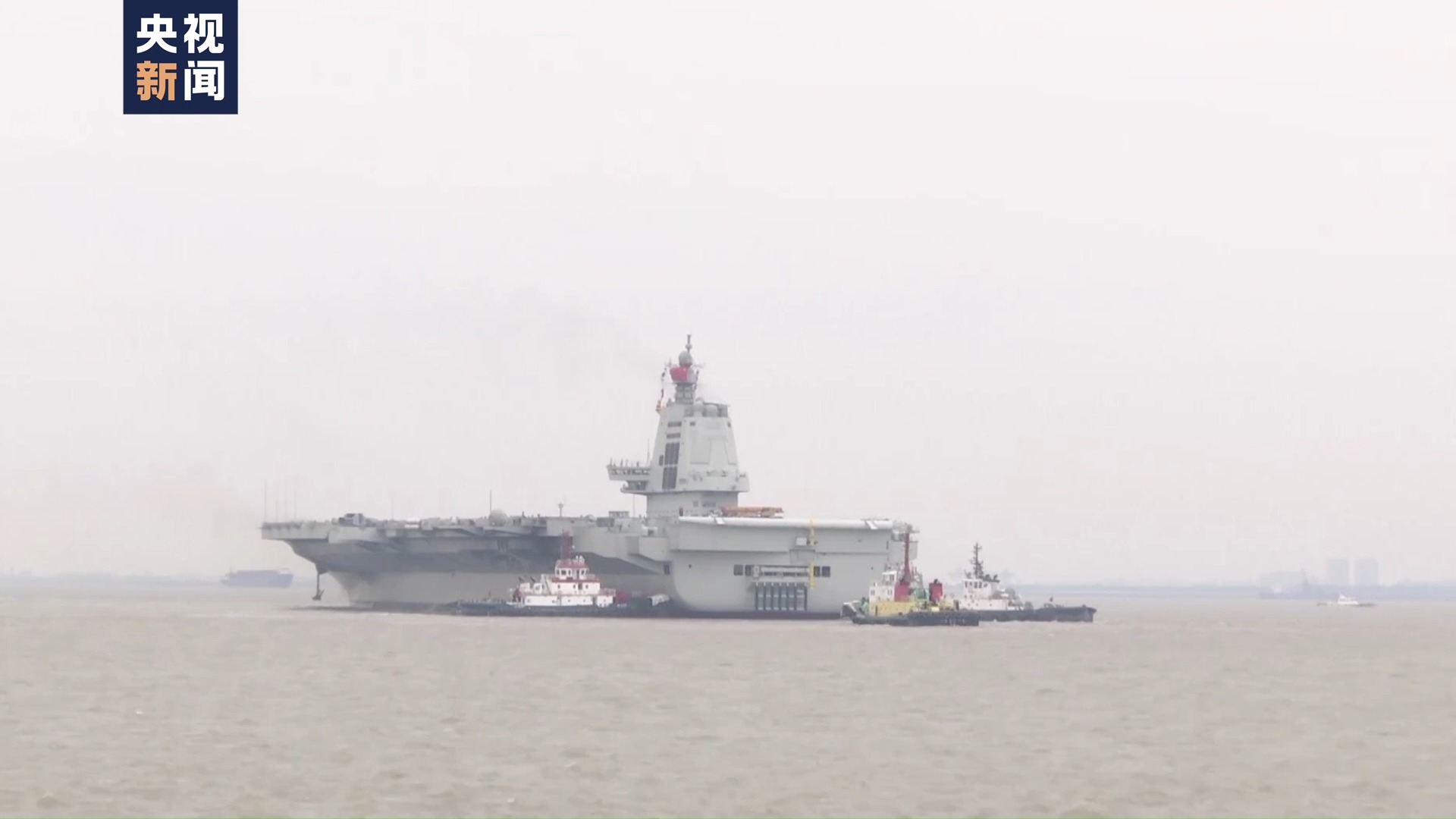 我國(guó)第三艘航空母艦福建艦在多艘拖船的牽引下,正在緩緩地駛離上海江南造船廠的碼頭,赴相關(guān)海域開展首次航行試驗(yàn)。