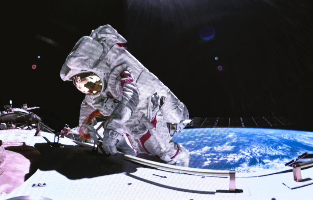 2024年3月2日,在北京航天飛行控制中心拍攝的神舟十七號(hào)航天員湯洪波在空間站組合體艙外作業(yè)。