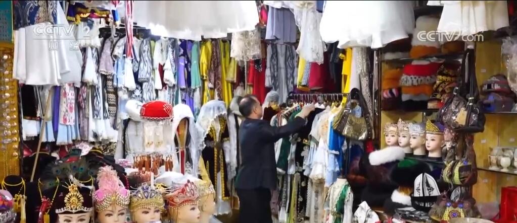在總臺(tái)2024年春晚舞臺(tái)上,演員們身穿特色服飾進(jìn)行表演,驚艷全場。春晚過后,慕名前來購買和定制艾特萊斯服飾的游客不斷增加。努爾·買買提原本在當(dāng)?shù)亟?jīng)營一家數(shù)碼產(chǎn)品店鋪,看到旅拍店艾特萊斯服飾等傳統(tǒng)民族服裝的租賃和定制需求增加,他便在喀什古城開了一家民族服裝綜合店。