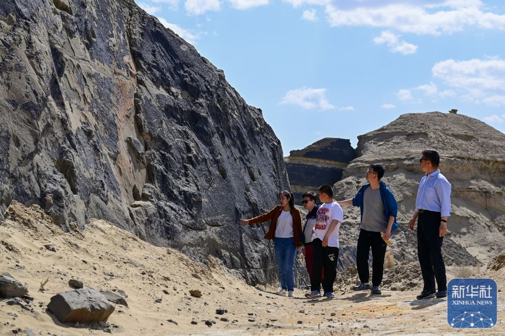 在新疆克拉瑪依市烏爾禾區(qū),游客在天然瀝青礦參觀游覽(5月1日攝)。