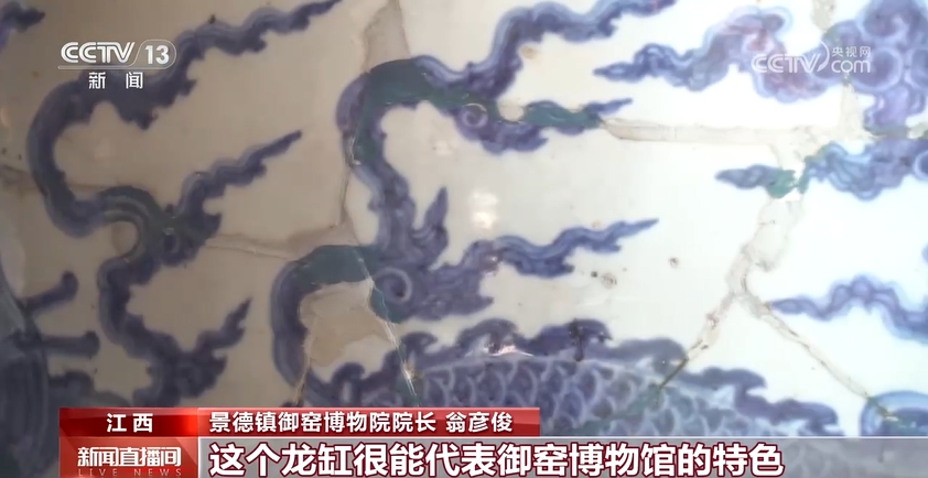 景德鎮(zhèn)御窯博物院院長(zhǎng) 翁彥俊:我們的所有的展品都來(lái)自于我們身后的御窯廠,通過(guò)考古挖掘出來(lái)的。當(dāng)年御窯對(duì)落選品的處理制度非常嚴(yán)格,不合格的就要打碎還集中掩埋,所以我們能夠發(fā)現(xiàn)這么多的碎片,并且能夠把它拼對(duì)出來(lái)。這個(gè)龍缸很能代表御窯博物館的特色。