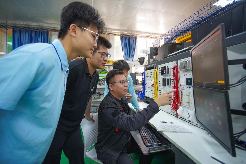 梁嘉偉(前排右一坐者)正在向?qū)W生傳授技術(shù)課程。新華社記者胡拿云 攝