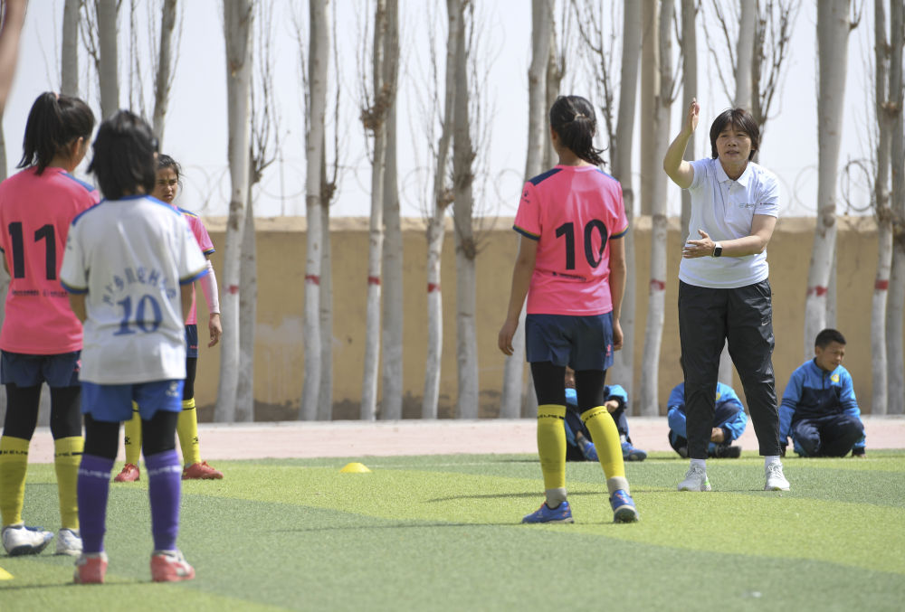 中國女足前主教練水慶霞帶孩子們一起訓練。
